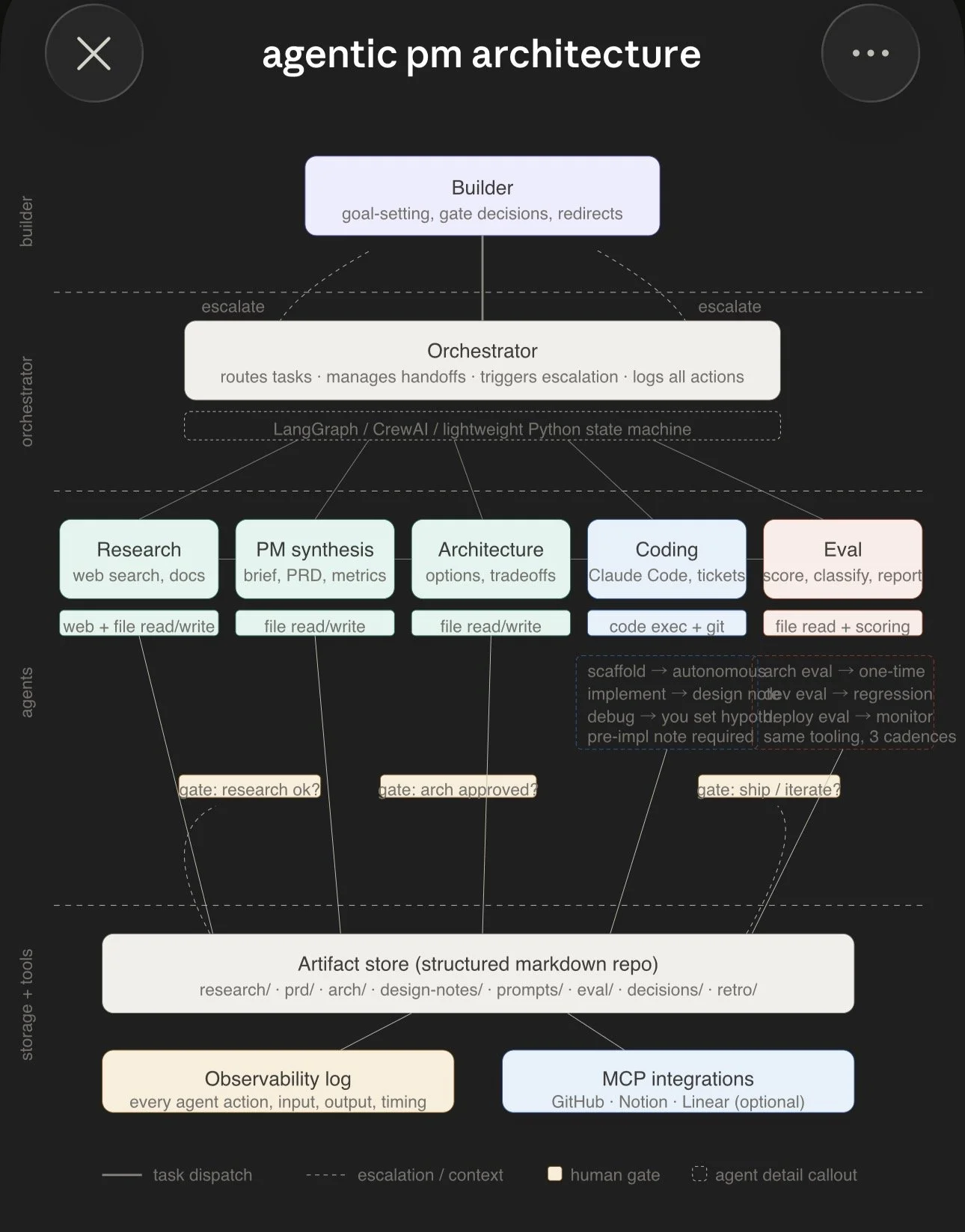 I built this for PM work because that's what I know. But the underlying structure — break work into streams, match each stream to a capability, put human gates at the high-leverage decision points — can be adapted for different roles and skillsets. A developer might spend most of their time at the architecture and eval gates. A founder might focus on the research and synthesis gates. The pattern is the same even if the labels change.